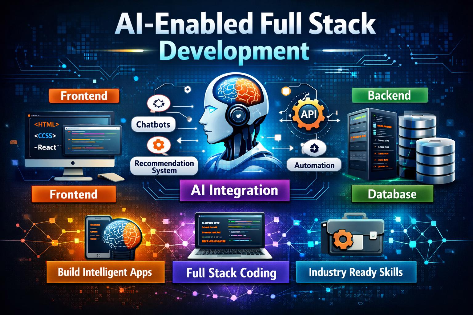 AI-Enabled Full Stack Development is a program that teaches how to build complete web applications (frontend + backend + database) integrated with Artificial Intelligence features like chatbots, recommendation systems, and smart automation. It focuses on hands-on learning to develop intelligent, scalable, and industry-ready applications.